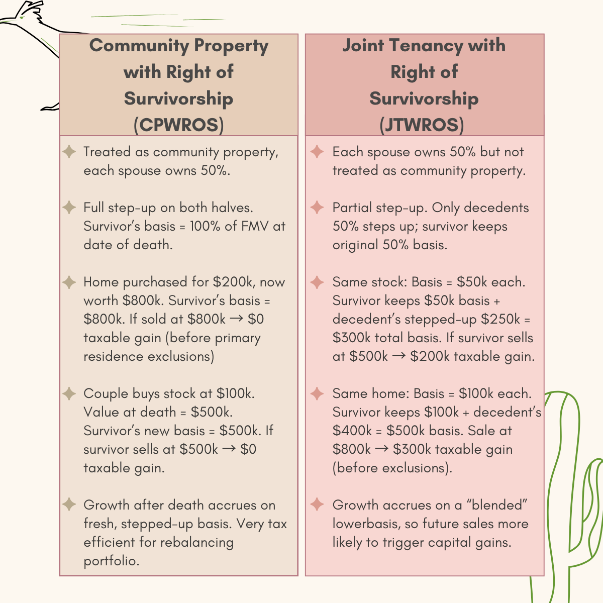 With CPWROS (the "double step-up"): In a community property state like Arizona, federal tax law provides a major tax advantage. When the first spouse dies, the basis of the entire property—both the deceased's and the survivor's halves—is "stepped up" to the fair market value at the time of death. This effectively erases any capital gains that occurred during the marriage.